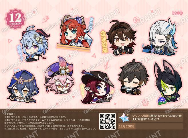 大人気ゲーム『原神』から、キャラクターの誕生日に合わせた「キャラクター生誕祭ブロマイド」や、「オリジナル描きおろしカレンダー」、ゲーム内で使用できるアイテムがもらえるゲーム内アイテム交換コード付き「誕生日キャラステッカー」が、ファミリーマート店内マルチコピー機サービス「ファミマプリント」にて、2025年1月より全国のファミリーマートで展開されています。