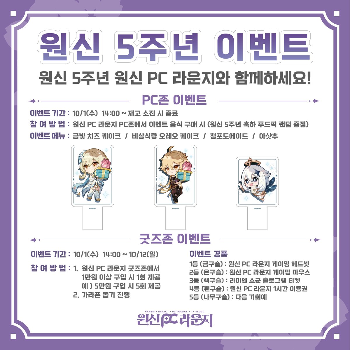 韓国でオープンしている「原神PCラウンジ in Seoul」にて、『原神』5周年記念イベントが2025年10月1日から開催されることが決定しました。